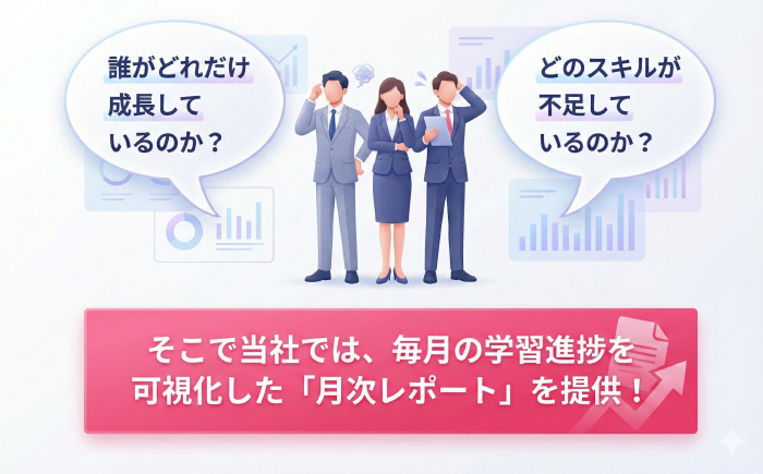 当社では、受講生一人ひとりの学習進捗や習熟度をデータとして可視化し、毎月詳細な「月次レポート」としてご提供しています。
